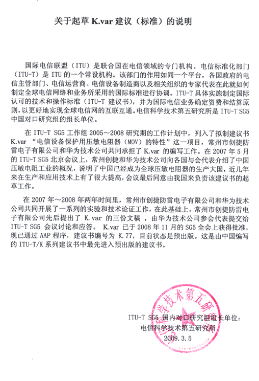 常州创捷起草ITU“电信设备保护用压敏电阻器”国际标准